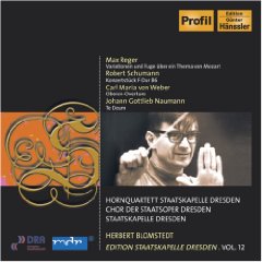 Max REGER (1873 – 1916): Variations on a theme of Mozart for orchestra Robert SCHUMANN (1810 – 1856): Concert Piece in F major Op. 86 for four horns and great orchestra Carl Maria von WEBER (1786 – 1826): Oberon Overture Johann Gottlieb NAUMANN (1741 – 1801): Te Deum for choir and orchestra Staatskapelle Dresden / Herbert Blomstedt